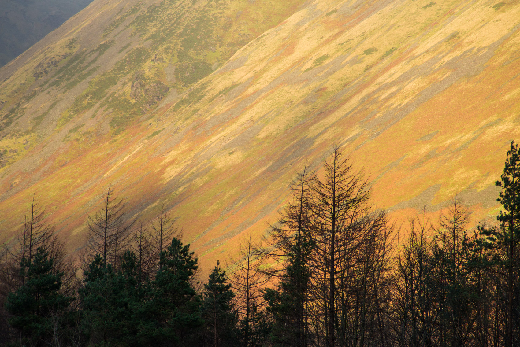 The clouds withdrew and the sun played a slow dance of lines on Yewbarrow, then revealed the upper reaches of Great Gable and Scafell. We stopped by the lapping water at the lake’s shore to watch the unveiling of bronze on the fells, and the turning of the lake’s surface from foreboding slate grey to a playful deep blue. The day was improving.