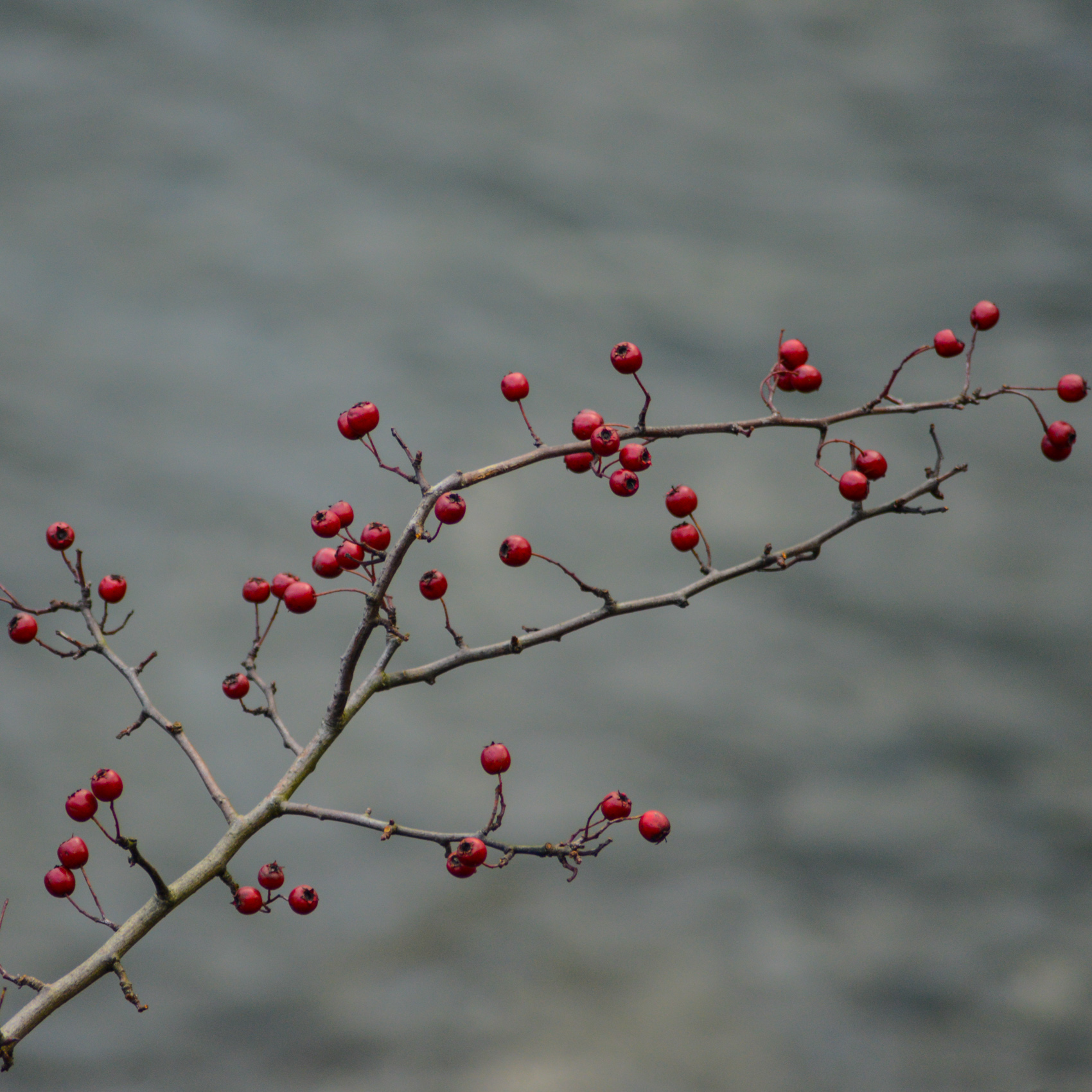 Beyond the farmland and the gate that opens on to the fell, the path was a stream. There has been so much rain this month, that’s hardly surprising. Above us, high above the highest of the tops, gulls played on the wind. Their white against a greying sky. On the lake, the wind drew lines on the water. Its presence everywhere. Along the lake’s stony edge, hawthorns have rooted, scraggy, determined. Their berries are rich drops of red, brought to life each time the sun sneaks out from the clouds.