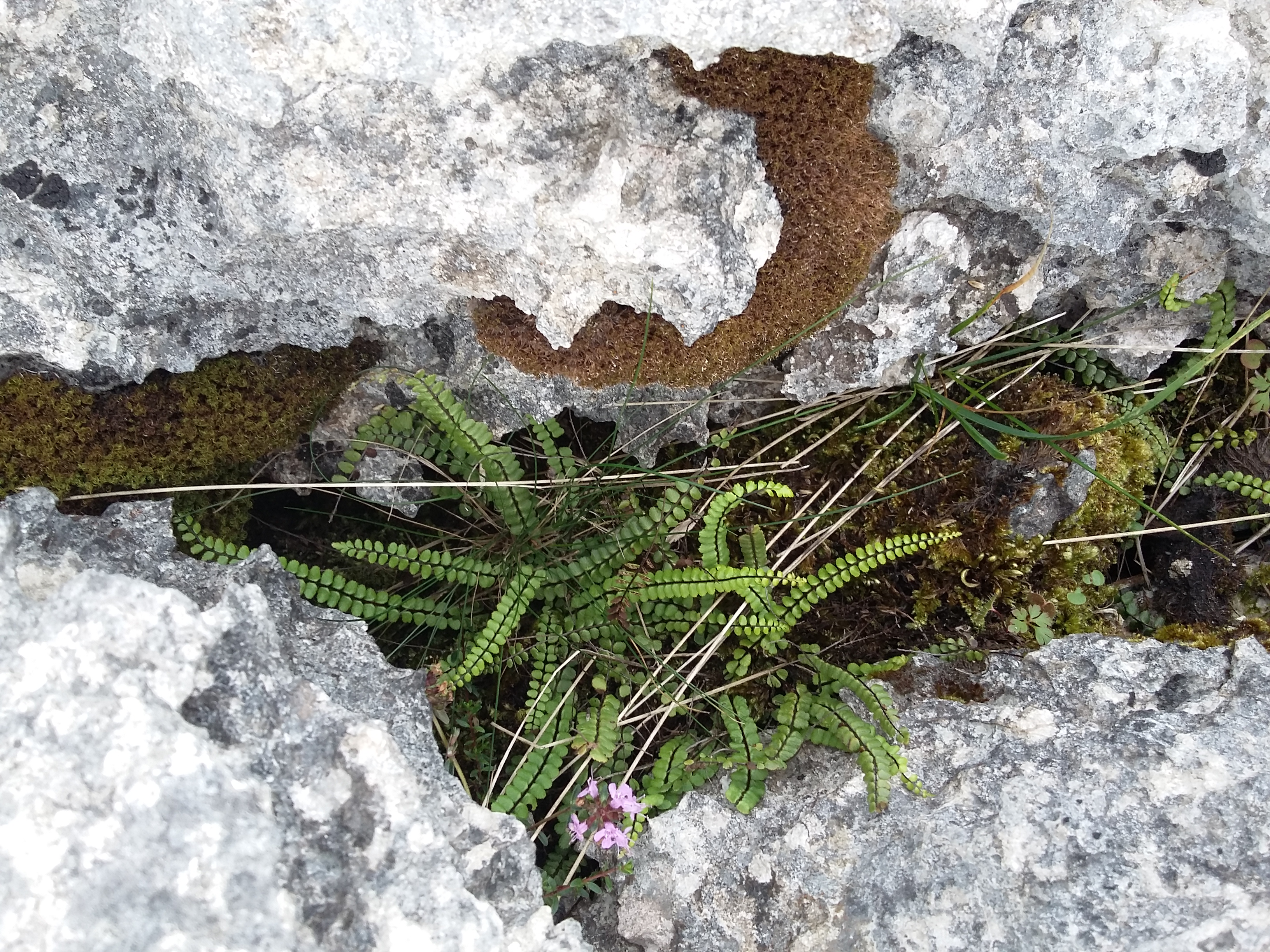 Grassland soon gives way to limestone, as if the hill is bearing itself and its history, revealing its fossilised story in pitted limestone shaped over thousands of years into clints (blocks or the surface of the pavement) and grikes (fissures) We dallied here, spying hart’s tongue ferns, herb Robert, wood sorrel, dogs mercury and other plants that are all indicators of woodland – reminders that trees once stood on this exposed and rocky land. Now the trees we spot can be counted on one hand, with the Little Asby Hawthorn the most striking. Others don’t make it beyond shrub height, instead hunkering down in between the stone slabs and keeping their foliage below the nibble-reach of sheep.