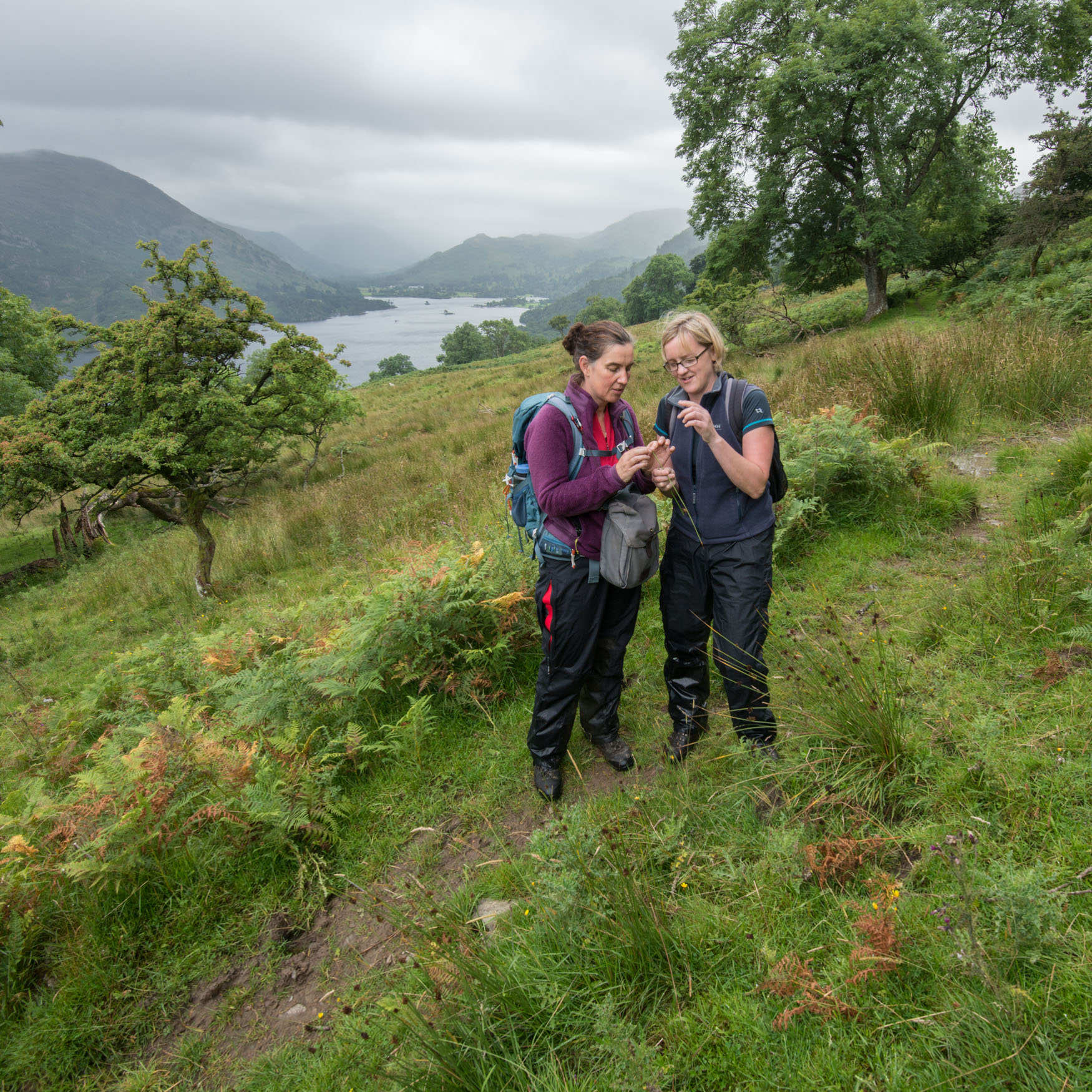 We have walked through the woodland identifying species along the way, and ending up at the Glencoyne Pine. Cath hasn’t noticed this tree before, and takes in the scene. ‘This tree has a great view over the woodland pasture. In fact, it’s got a good view of what the World Heritage Site bid is all about, hasn’t it?’