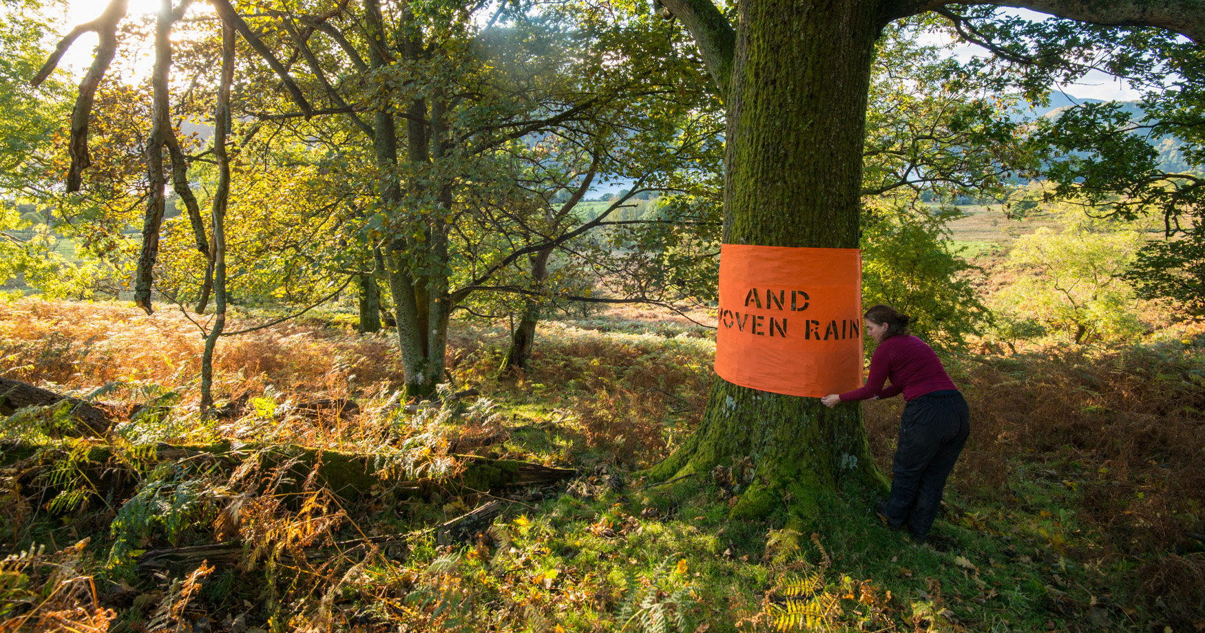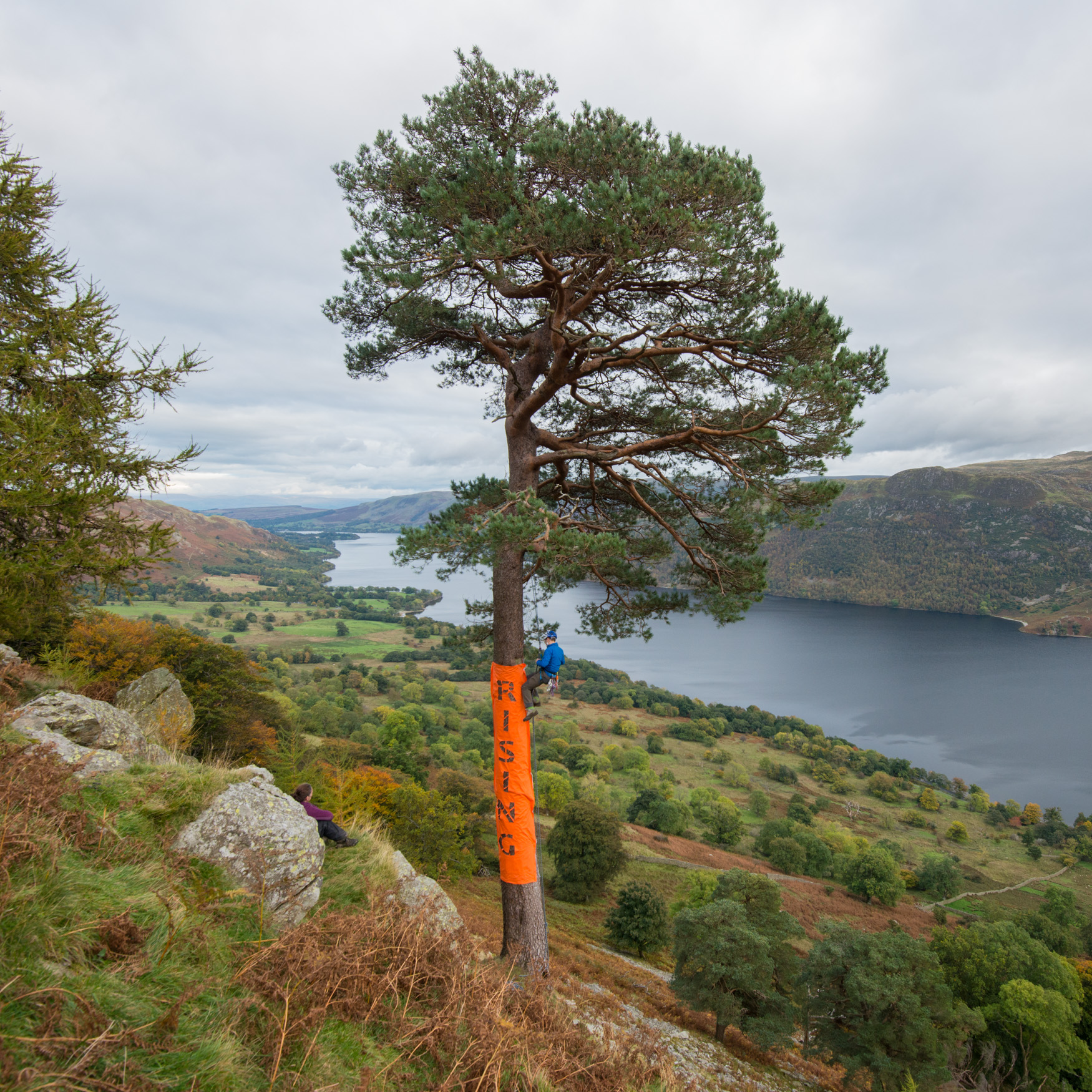 After many, many hours preparing the pieces of orange cloth, hanging them onto the trees was relatively simple and quick, and it was good to have some help along the way – thank you Cath and Dave for helping us tie the strings and make sure the words were as straight as the trees allowed them to be. The last and largest word, RISING, however, which takes up four metres of cloth, was not quite so straightforward. Attaching that to the Pine took expertise in climbing that Rob and I don’t have, and we’re hugely grateful to Martin for having the nerve and the skill to get up there (he made it look so easy).