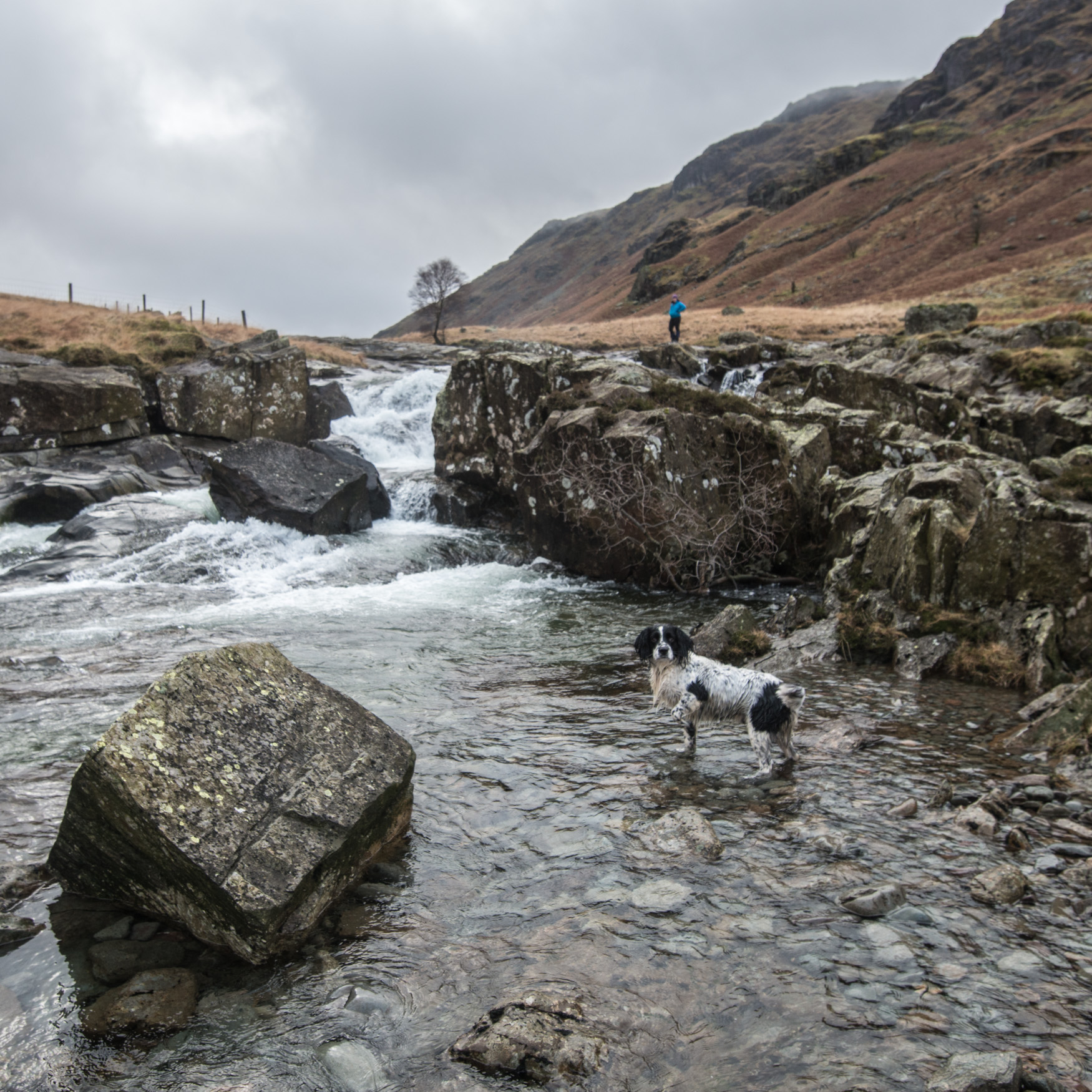 We’ve yet to refine the details but we’re getting closer. We wanted to understand the flow of the water more closely so we used a pretty high-tech piece of equipment: a tennis ball. We threw it into the beck just above the tree and watched. The water gushes and becomes white and frantic at intervals as it travels downhill. The ball found the course of least resistance and at times disappeared. On some runs it became stuck in an eddy where even though the water seems to be constantly descending, in actual fact it returns on itself. The ball only progressed so far and then travelled back against the flow, caught in a repeated circular pattern. We had to fish it out or poke it out of its rut. At the end of each trial, Guilly had his own very important role to play – and he seemed to relish it. Jumping in the deep water and swimming to catch the bobbing green ball was a job few spaniels would turn down.