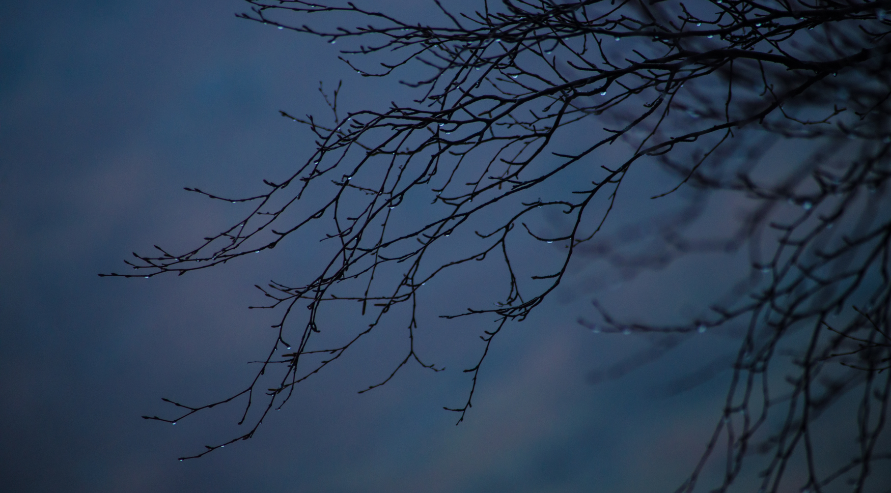 Opposite, to the east, the sky is lightening in a gradual paling of blue. Suggestions of clouds are moving fast, peach embers. A single star shines above the tree. All the while the water tumbles, fast and white.
