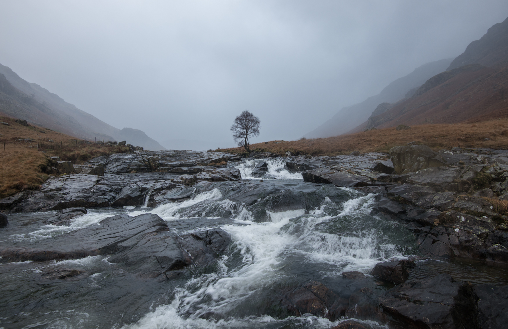The tree holds the frame beautifully, breaks the skyline, cradled by fells. Everything flowing down, pouring down, through the tree to me. The colours are better in these conditions than in sunshine. Black is really black. White is really white. In this contrast all the elements come alive and there’s a greater sense of the tree’s isolation … a human concept, yes, but you feel the lack of other trees. You feel it more in this kind of weather.