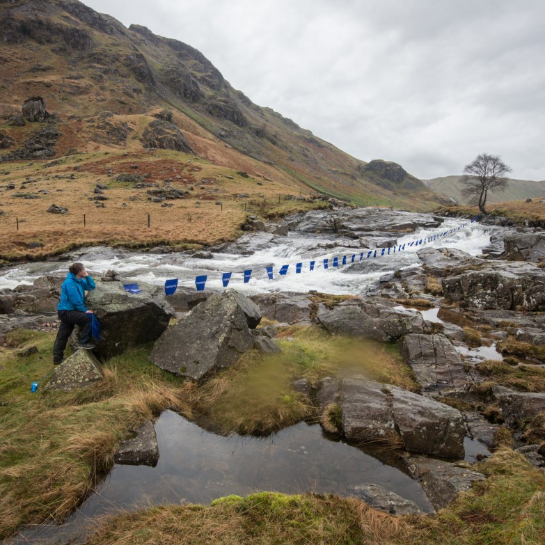 We ask how his ewes are – they’ve been scanned now and will be lambing soon – and chat about the past year. Joe fills us in on what’s happening in Borrowdale and we talk about the tree planting in the valley that has been done with the National Trust. We can see the sturdy wooden cages up on the fell beyond us that keep red deer and sheep away from young trees that, all being well, will become veterans of the future. I ask about the different flocks and farms that share the common land here, and Joe points out whose sheep go where. He maps the valley with the names of those who know its bogs, rocks, curves and rises well. I get a feel for it as a land of hefts, invisible borders held on fenceless fells as if stitched by footsteps of farmers and the flow of sheep from one side of the watershed to the other. We talk about the continual challenge of working out a way to find a balance here in the fells, where commoning can continue beside rich biodiversity. We discuss flooding and the likelihood of more flood events in the future, the development of hydro projects in Borrowdale, and even what’s happening at Sellafield. Before Rob and I get round to telling Joe about the string of blue above the water, he talks about the difficulty of getting accurate facts heard, particularly when it comes to decisions about land management and land use. Who hears what information, and what is done with it? Which voices are listened to and acted on? The challenge of finding balance in valleys like Borrowdale is not new, but perhaps now more than ever, with the pressures of flood risk and the uncertainty of policy changes in the face of Brexit, clear communication is needed.