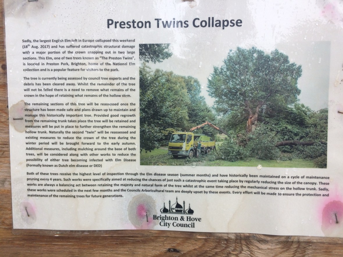 Information about the collapse of the crown of one of The Preston Twins, elm trees in Brighton.