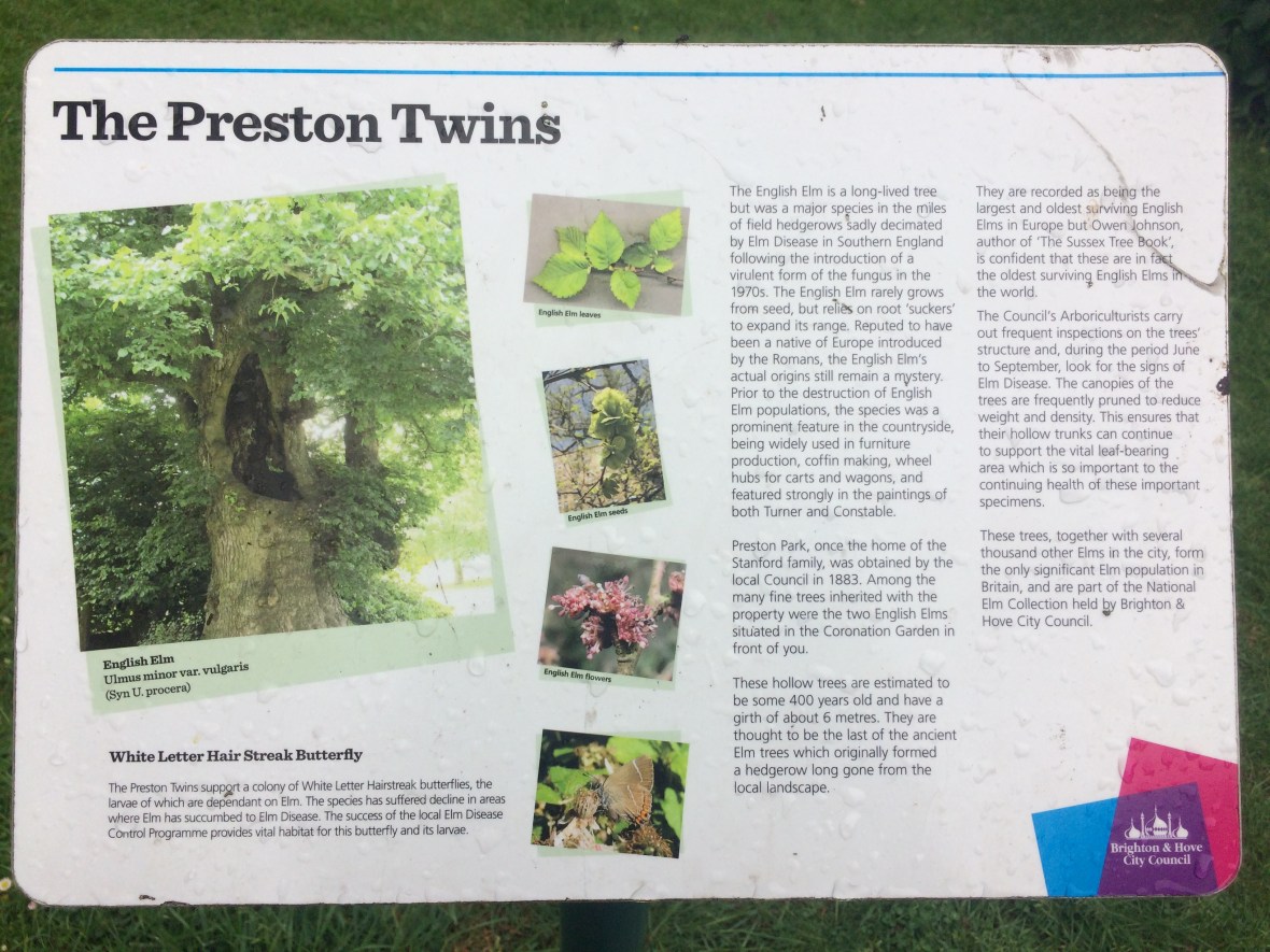 The plaque beside the trees in Preston Park Information about The Preston Twins: England’s two oldest elm trees.