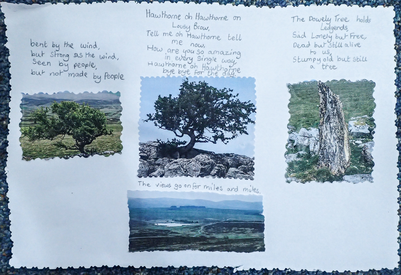 On our walk up to the Hawthorn we stopped at the Dowly tree: the lonely, melancholy tree that is now a bare bird-pecked stump. Their creative minds spewed out stories of witches and strange night-time goings on and poems began to emerge.