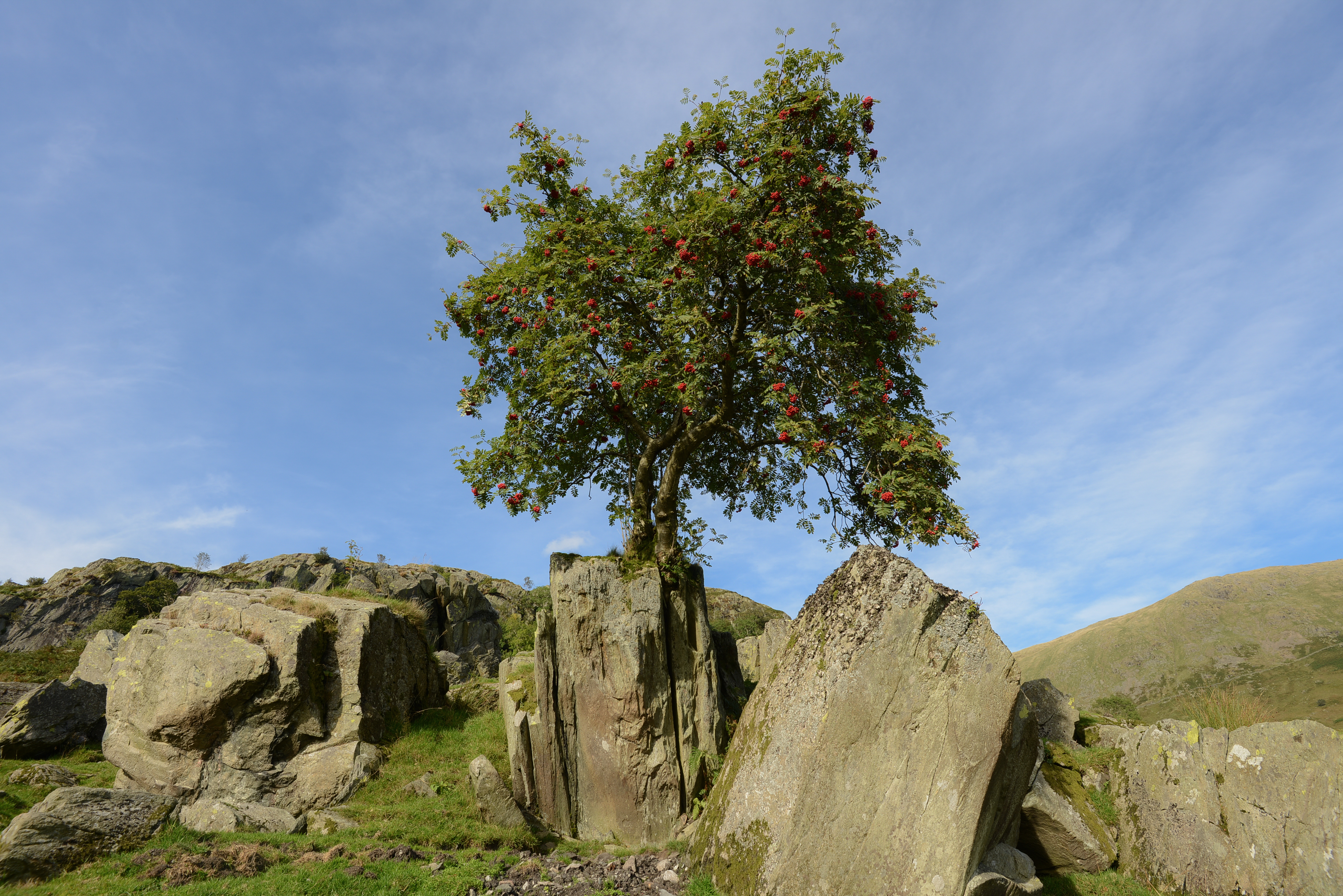 We had passed several trees but nothing sung out to us until we came to this spot and there it was – leafless but remarkable, high up on a rock with its roots snaking through the crevices. We had a bit of a discussion. The alder close to this rowan is equally remarkable, hollowed out and holding within its trunk a view of the fells but the rowan won out for us in the end. A second visit in summer showed us just how dramatically a small tree like this can change.